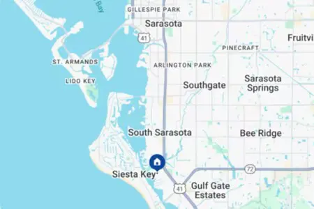 • Siesta Key Village: 3.5 miles, roughly 10 minutes.