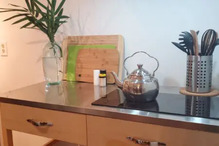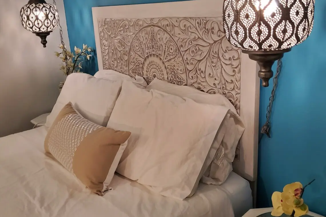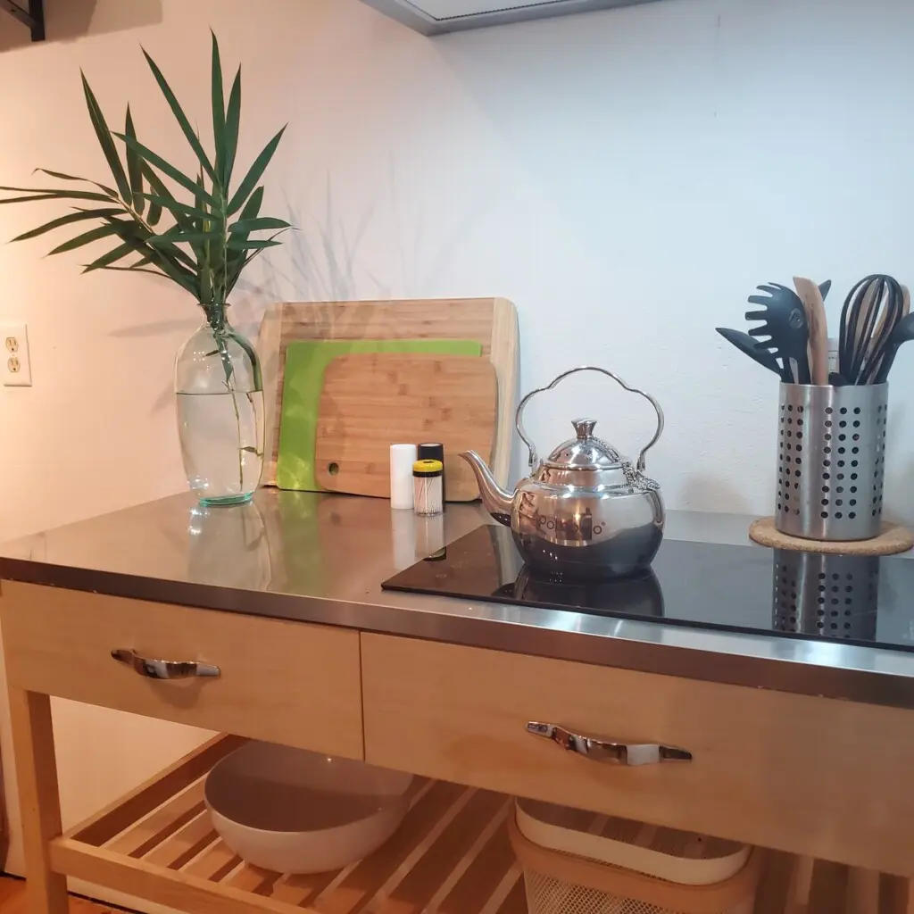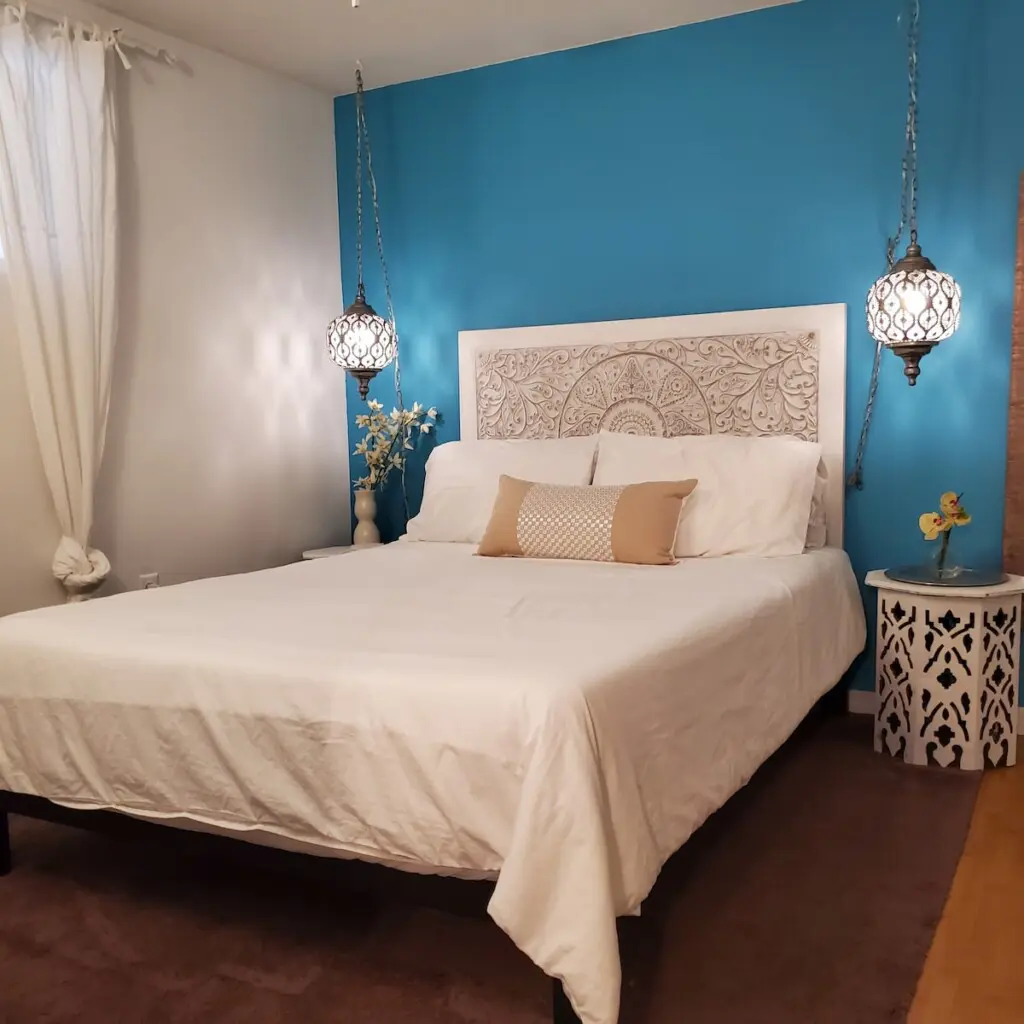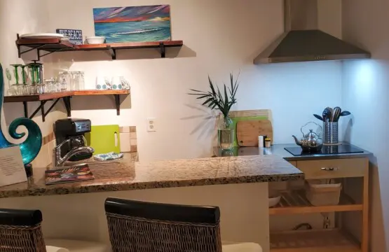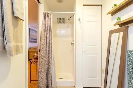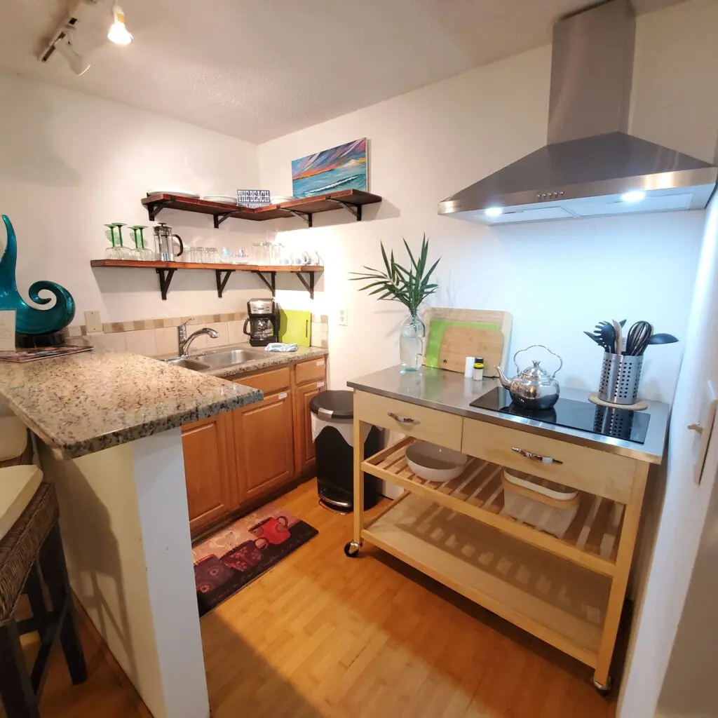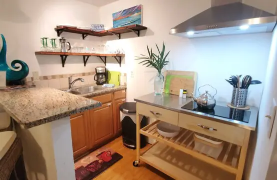 An open concept living area provides enough space to relax and unwind or unfurl your yoga mat for morning stretching and meditation. Free Wifi is provided, along with flat-screen televisions in both the living and bedroom, hosting streaming premium channels for your enjoyment. Sleep in the peaceful cocoon of your bedroom, tucked into a quiet corner with a queen bed offering all-natural linens and subdued lighting, ensuring a quiet, restful stay.