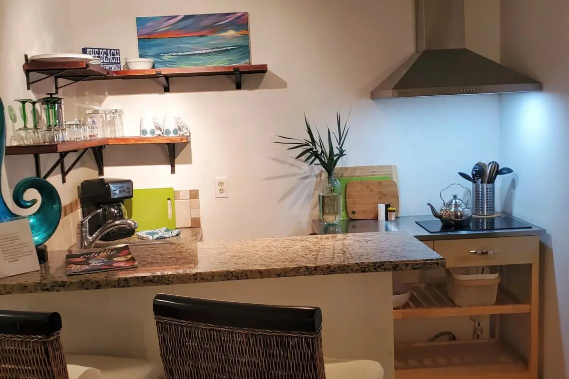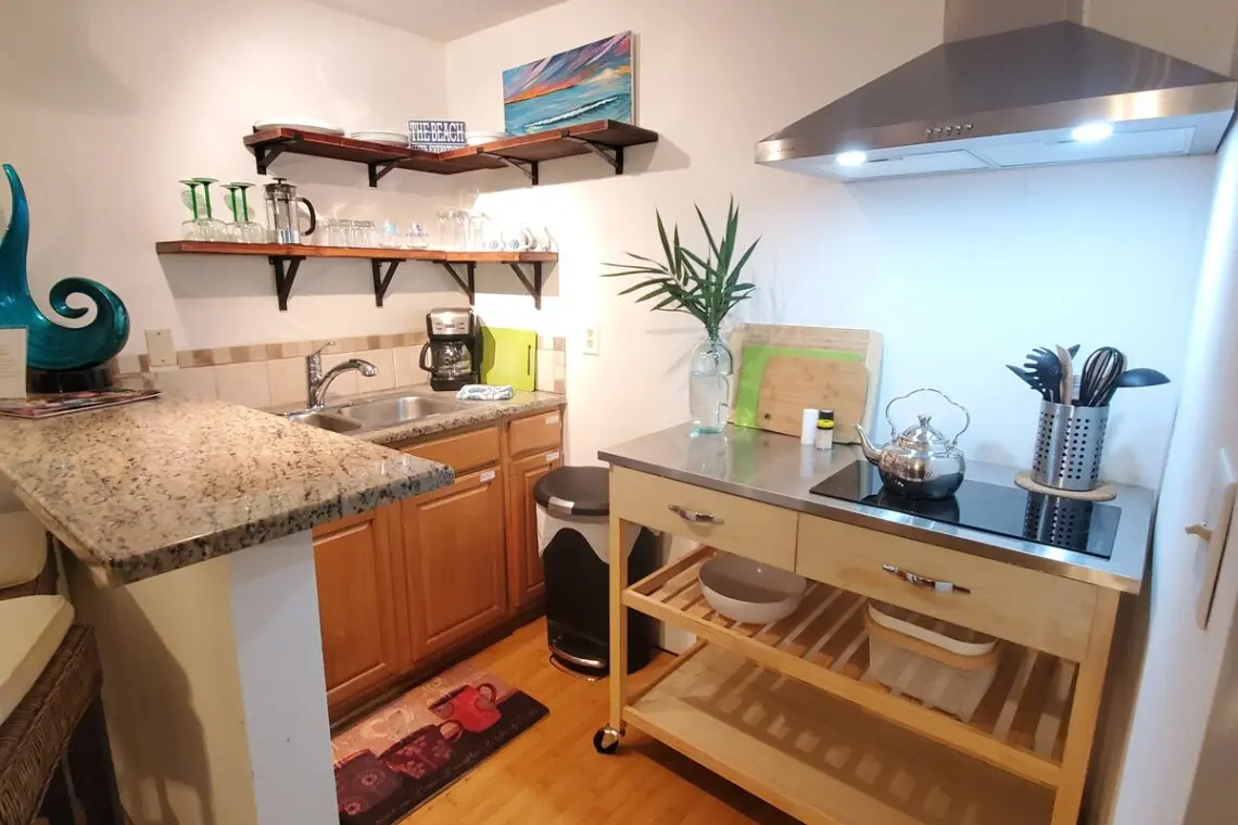 Escape the hustle and bustle of everyday life in this artfully appointed 1 bedroom/1 bath apartment inspired by the calming tropical colors and textures of nature. Step through the private entrance into the well-appointed apartment featuring a compact kitchen offering all the accouterments to make a meal at home, from coffee maker to microwave, cookware to cocktail glasses, and cutlery to slice into fresh limes for your Florida inspired cocktail!