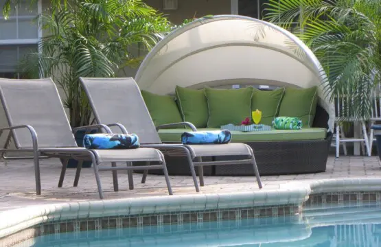 Just outside the French doors is a lovely outdoor space that is shared with only one other unit. Featuring a large pool deck with a covered patio and island-inspired lounge. The outdoor kitchen with gas grill and dining area with seating for six makes the perfect setting for an evening of dining al fresco. When you’re not at Siesta beach or exploring the wonders of Sarasota, you’ll enjoy the large sparkling pool with multiple seating areas, ideal for soaking up the Florida sun or tucking under the shaded lounger with a good book or an afternoon siesta. Pool toys and towels are provided for your use, as well as coolers and beach chairs you’re welcome to use at the beach. In the evening, you’re invited to enjoy the fire pit located in the yard where you can reminisce about your day while gazing into the crackling fire or making S’mores.