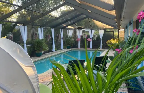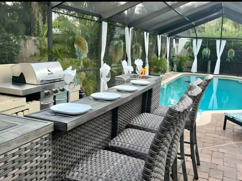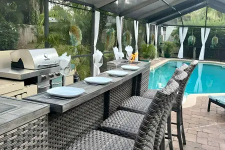 Just outside the kitchen is a sparkling pool, comfortable lounge area & outdoor kitchen with gas grill, and fire pit.